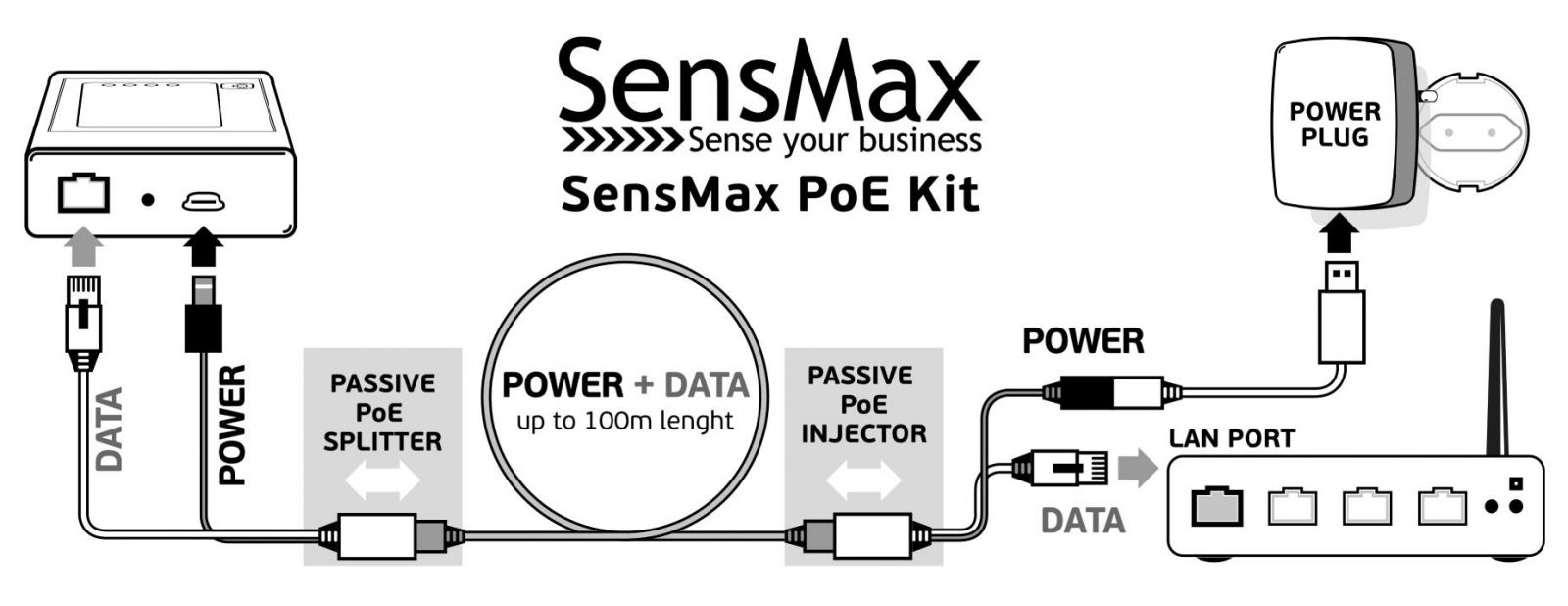 Power Over Ethernet -sovitin SensMax SMX -yhdyskäytäville. Se mahdollistaa datayhdyskäytävän virransyötön LAN-kaapelista. Voit käyttää tätä PoE-sovitinta tavallisen AC/DC-virtalähteen sijaan, jos reitittimesi tukee PoE-ominaisuutta.